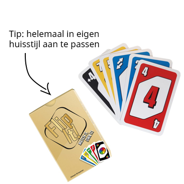 Een klein, leuk spelletje maakt het uitpakken van het pakket extra feestelijk. Denk bijvoorbeeld aan een kaartspel in jouw huisstijl of een houten torenspel met jouw logo. Zo voeg je een speelse twist toe aan het pakket.